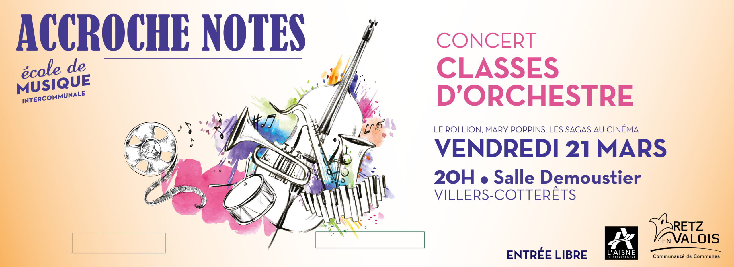 Rendez-vous le vendredi 21 mars à 20h à la salle Demoustier de Villers-Cotterêts pour le « Concert des classes d’orchestres » sur le thème des films.