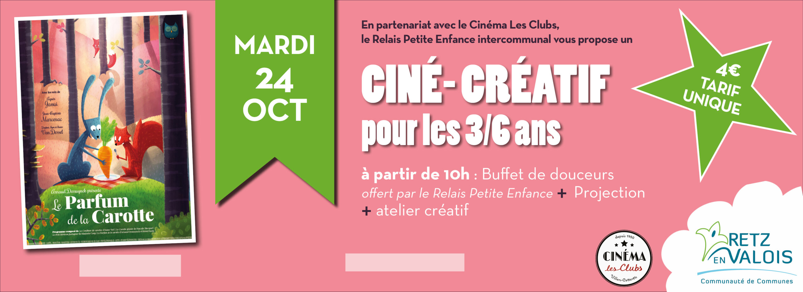 Le Relais Petite Enfance de la Communauté de Communes Retz-en-Valois (CCRV) vous propose son nouveau ciné-créatif, en partenariat avec le cinéma « Les Clubs » de Villers-Cotterêts. L’animation, à destination des enfants de 3 à 6 ans, se déroulera le mardi 24 octobre à partir de 10h, au cinéma de Villers-Cotterêts .